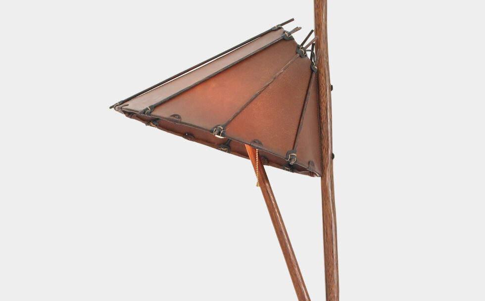 Floor lamp made from Palmwood and leather. Decorated with motifs.