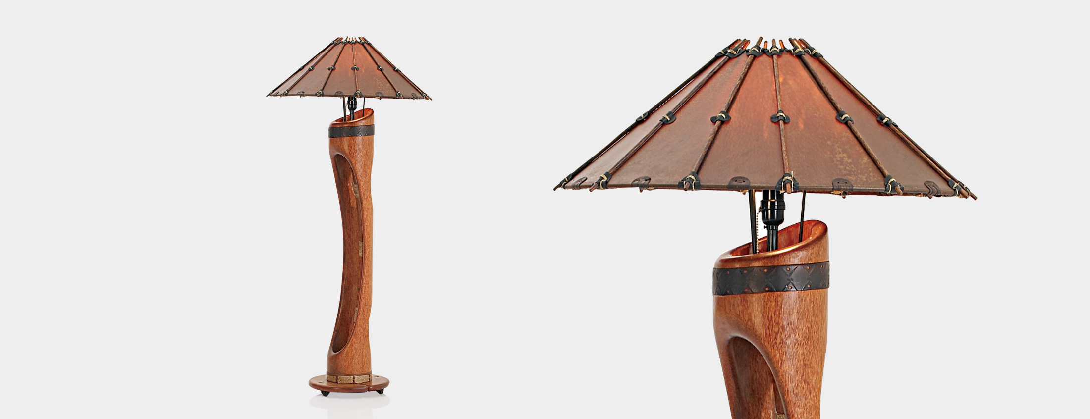 Floor lamp made from solid coconut trunk and leather. Decorated with motifs.